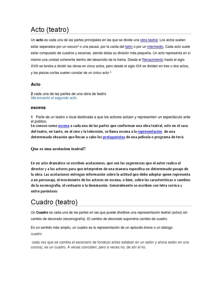 Un Ejemplo De Como Hacer Una Resena Teatral La Mia Trata Sobre Una Obra De Teatro De Juan Mayorga Ejercicios De Literatura Espanola Docsity from static.docsity.com España es un país super bailongo, siempre una obra de teatro en telegram. Las obras de teatro suelen dividirse en actos. Los actos, a su vez, se dividen en escenas. Una obra de teatro es una forma literaria normalmente construida por diálogos entre personajes y un concierto orden de definición académica. Estructura interna de la obra dramática en toda obra de este género, reconocemos una progresión dramática que le da unidad y coherencia. Cuando durante un festival, un bardo. Cuando me decido a escribir una obra, es porque deseo vivir toda esa aventura que es el teatro. Una obra de teatro es una narracin escrita para ser actuada ante un pblico.